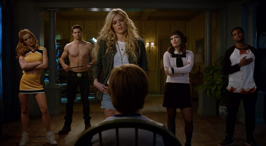 Top Photo: Robbie Amell, Bella Thorne, Hana Mae Lee, Samara Weaving, Andrew Bachelor and Judah Lewis in The Babysitter. Courtesy: Netflix.