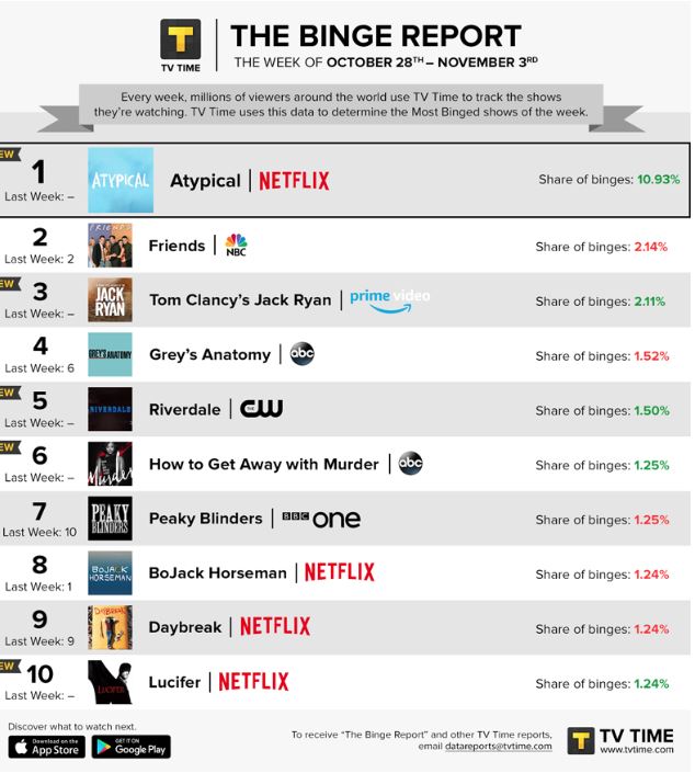 Netflix’s Atypical, a coming-of-age show, and Amazon Prime Video’s Tom Clancy’s Jack Ryan are sitting at the top to this week’s most binged shows according to TV tracker, TV Time.