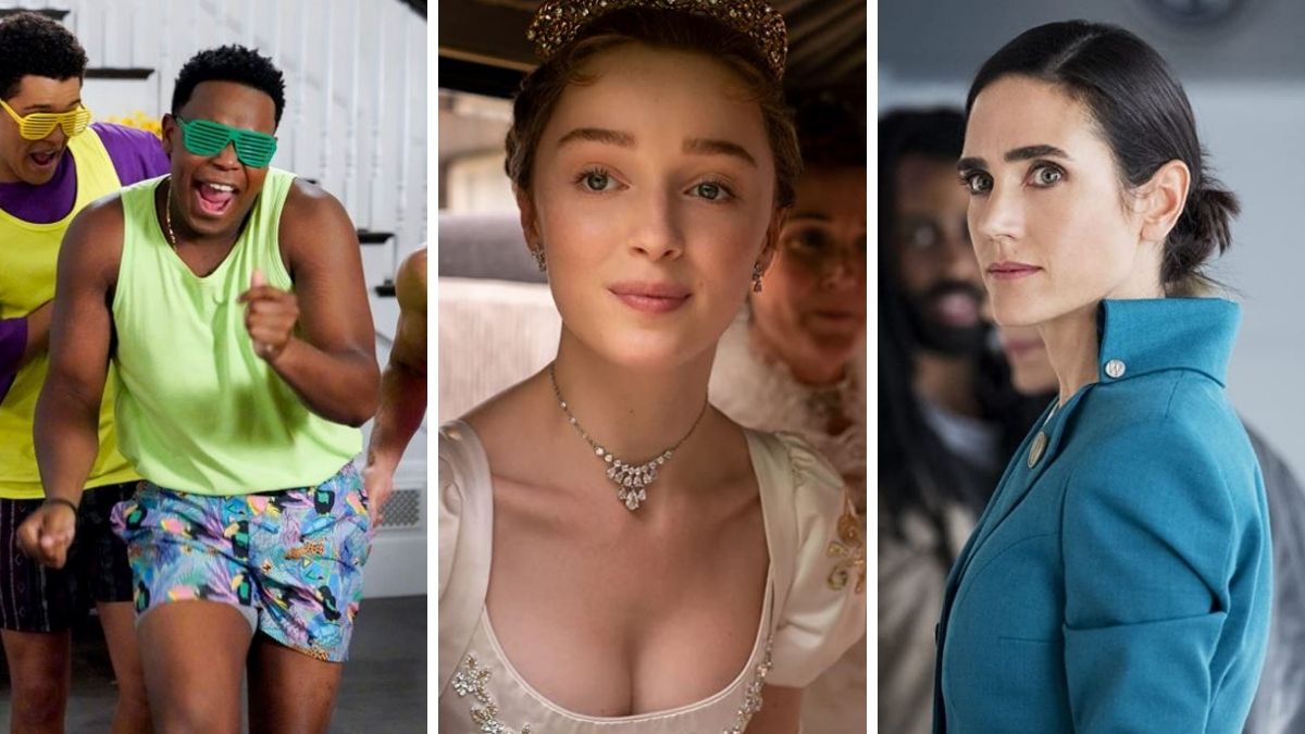 Top Photo: The cast of the new Saved by the Bell. Courtesy: Peacock. Jennifer Connelly and Daveed Diggs in Snowpiercer. Courtesy: AMC. Ruth Gemmell and Phoebe Dynevor in Bridgerton. Courtesy: Netflix.